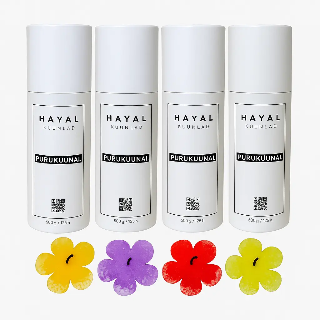 On saadaval erinevates toonides, et sobituda iga maitse ja interjööriga. Valikus on näiteks pastelsed toonid, must ja klassikaline valge. Igaüks neist on omaette dekoratiivne ese, mida ei pea isegi süütama, et ruumile ilu anda. Kui otsid unikaalset ja käsitööd väärtustavat kingitust, siis küünal kingituseks on alati hea valik.Puruküünal tuubis sobib ideaalselt ka ettevõtte kinkepakkidesse või tänukingituseks külalistele erisündmusel. Hayal küünlad sobivad suurepäraselt ka teie kodu ainulaadse küünlakaunistuse loomiseks või kasutamiseks erilistel üritustel ja sündmustel. Loo eriline meeleolu ja vali küünal, mis räägib lugusid läbi valguse ja värvi!