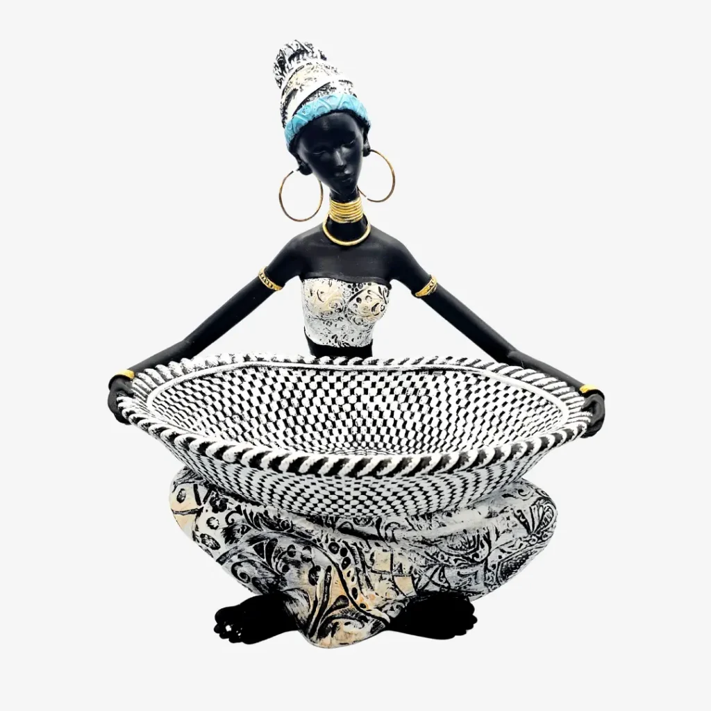 Skulptuur kujutab elegantset naist traditsioonilises riietuses, hoides käes mustvalget etno kaussi, mis sobib ehete, võtmete, maiustuste või lihtsalt esteetika hoidmiseks.